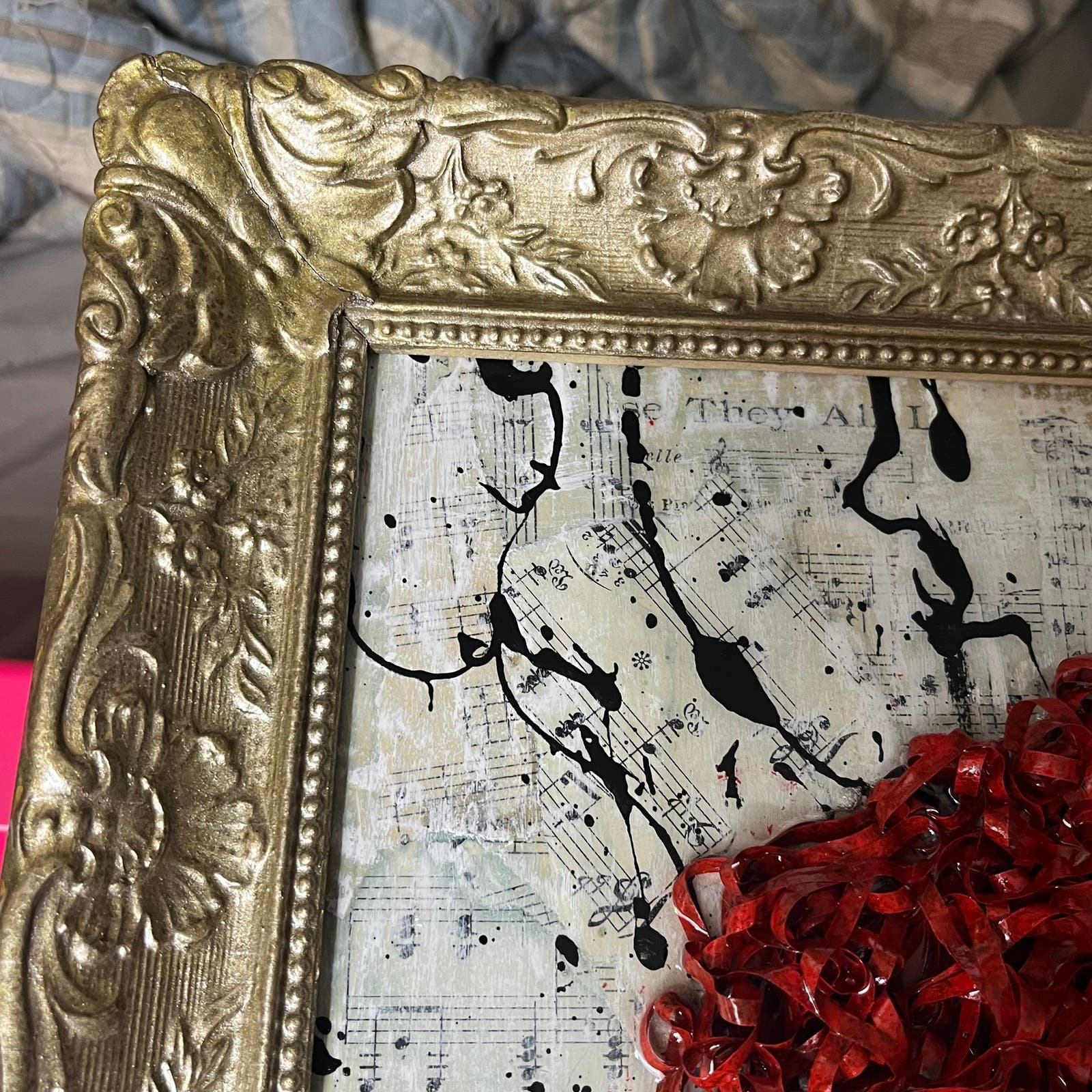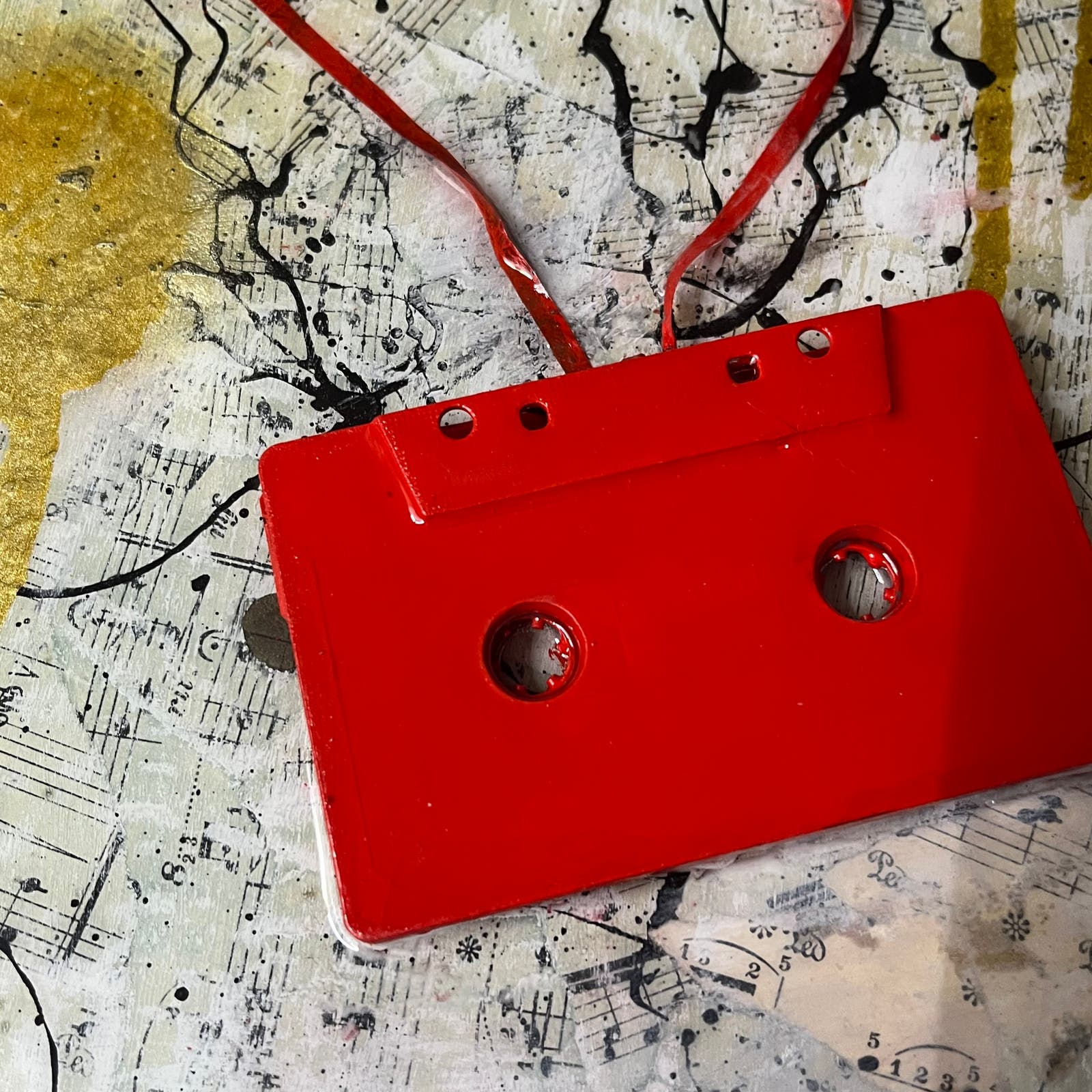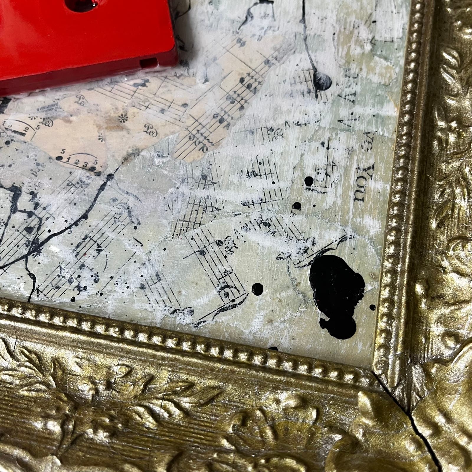 This is a Pop Art wall art sculpture made using a reclaimed cassette tape and other objects in an antique gold frame. Everything has been coated with epoxy, and it is ready to hang. Features a variety of materials including sheet music and paper dating back to 1907. Original piece by artist Sam Lewis. This is a great and affordable way to own a piece of original art and add a pop of color to your space. Also a great gift idea. Comes with signed COA certificate of authenticity.