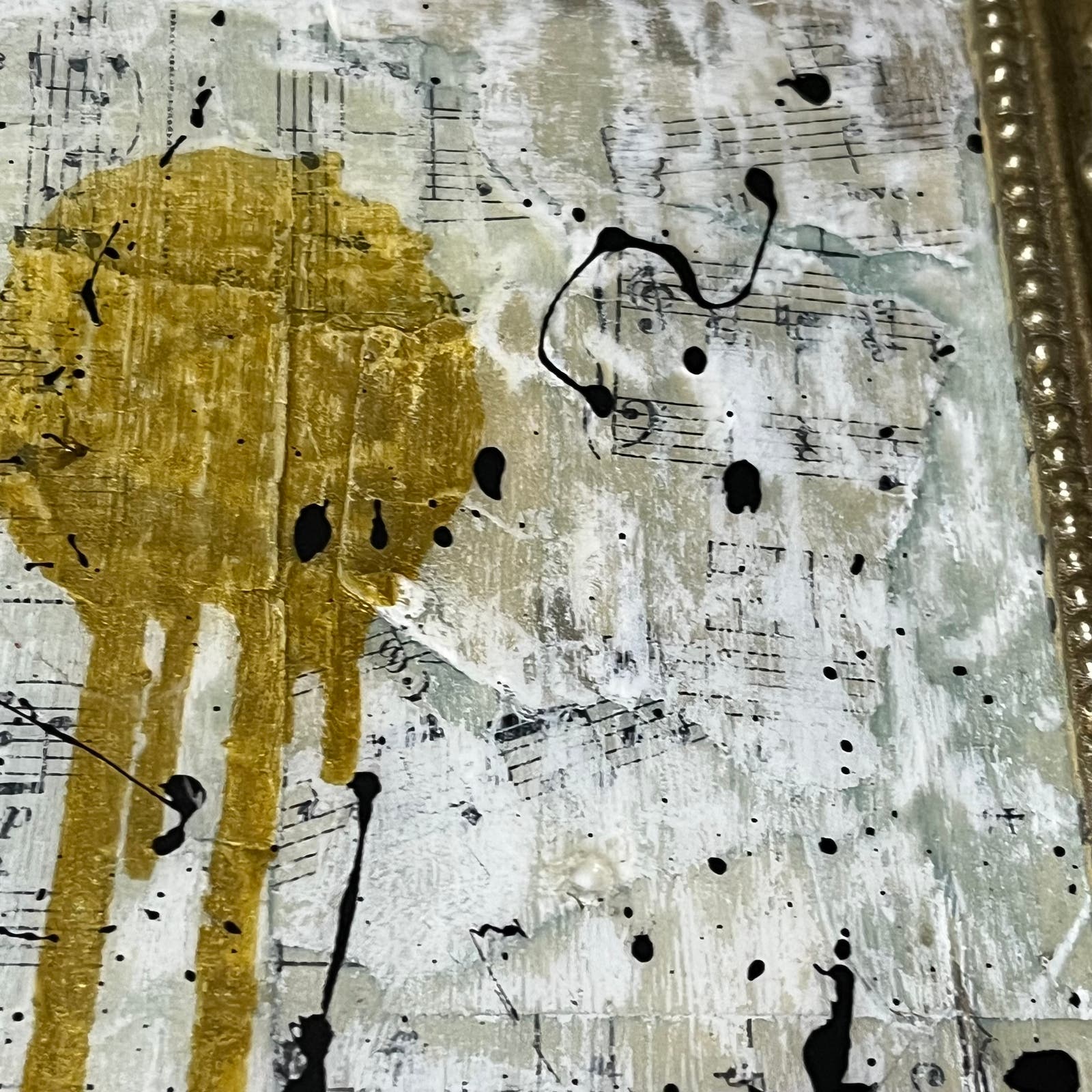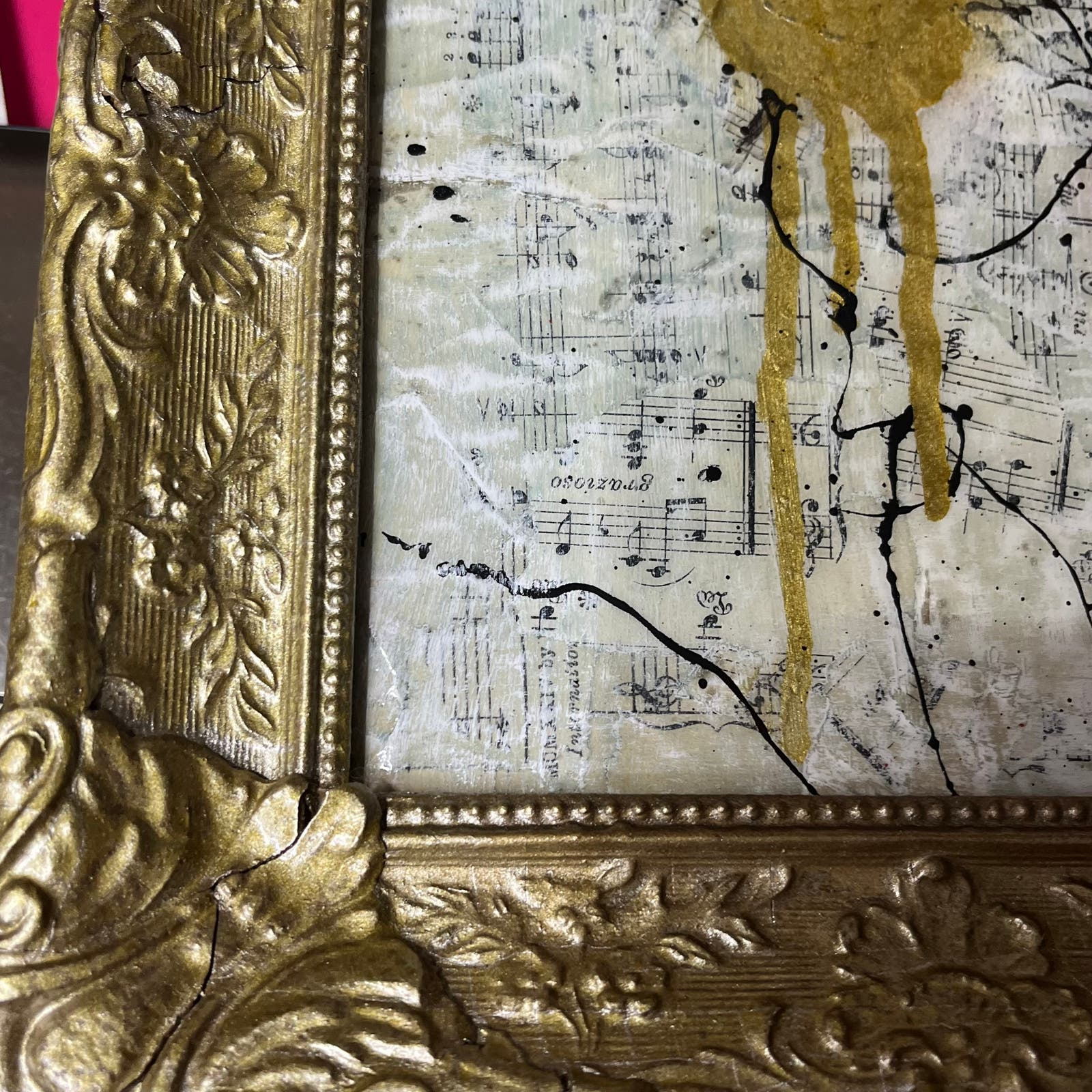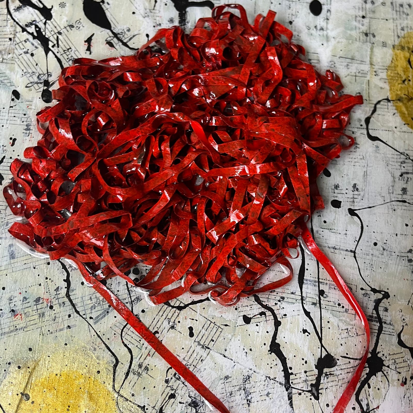 This is a Pop Art wall art sculpture made using a reclaimed cassette tape and other objects in an antique gold frame. Everything has been coated with epoxy, and it is ready to hang. Features a variety of materials including sheet music and paper dating back to 1907. Original piece by artist Sam Lewis. This is a great and affordable way to own a piece of original art and add a pop of color to your space. Also a great gift idea. Comes with signed COA certificate of authenticity.