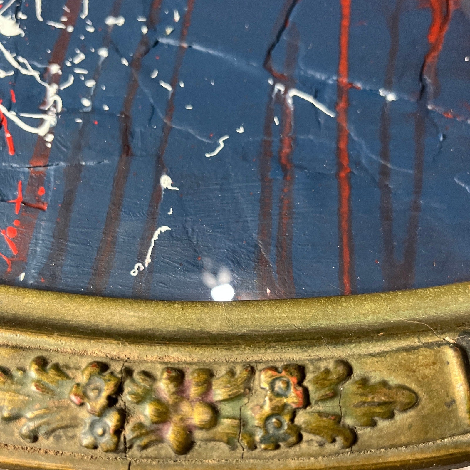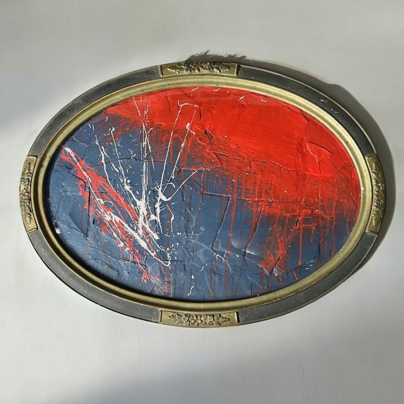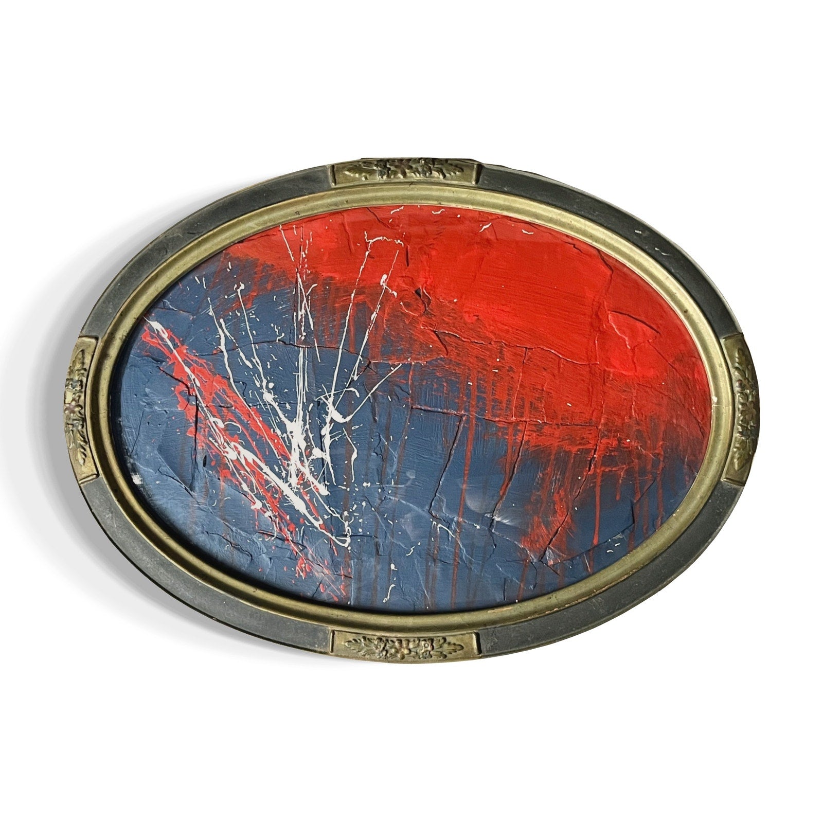 This piece is framed in an antique oval frame with convex glass, and measures about 16x22". This is an original painting by abstract artist Sam Lewis. This is a great and affordable way to own a piece of original art and add a pop of color to your space. Also a great gift idea. Ready to hang.