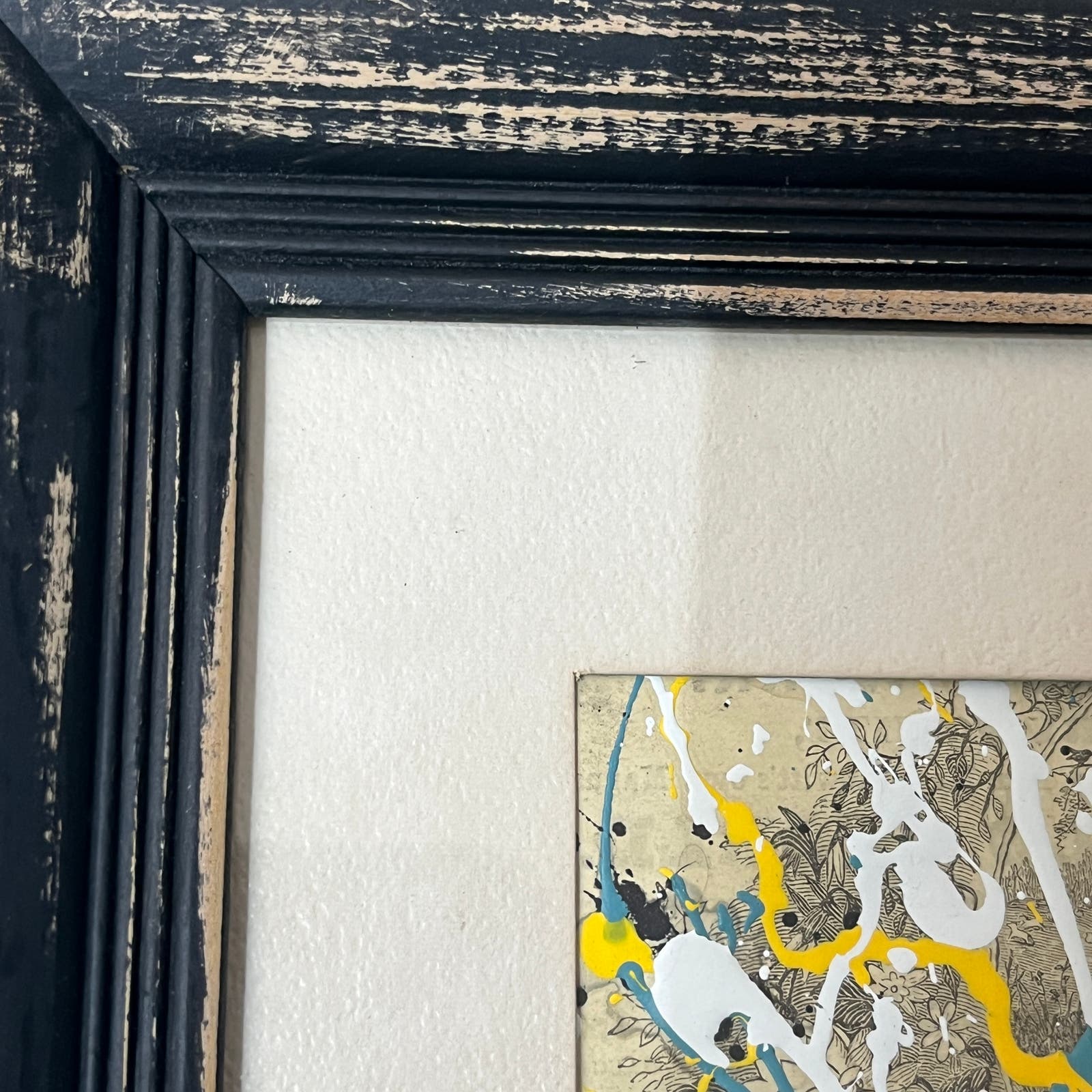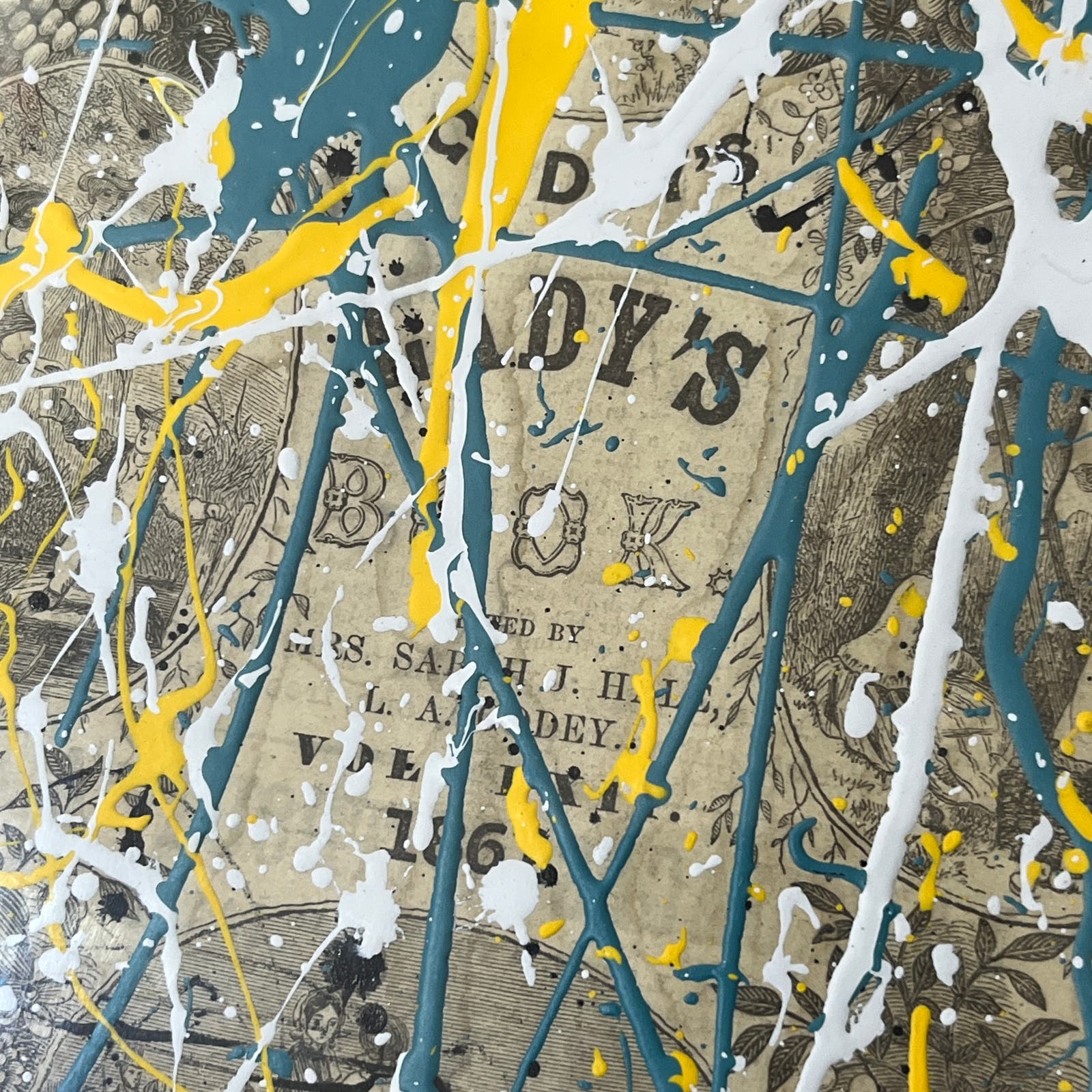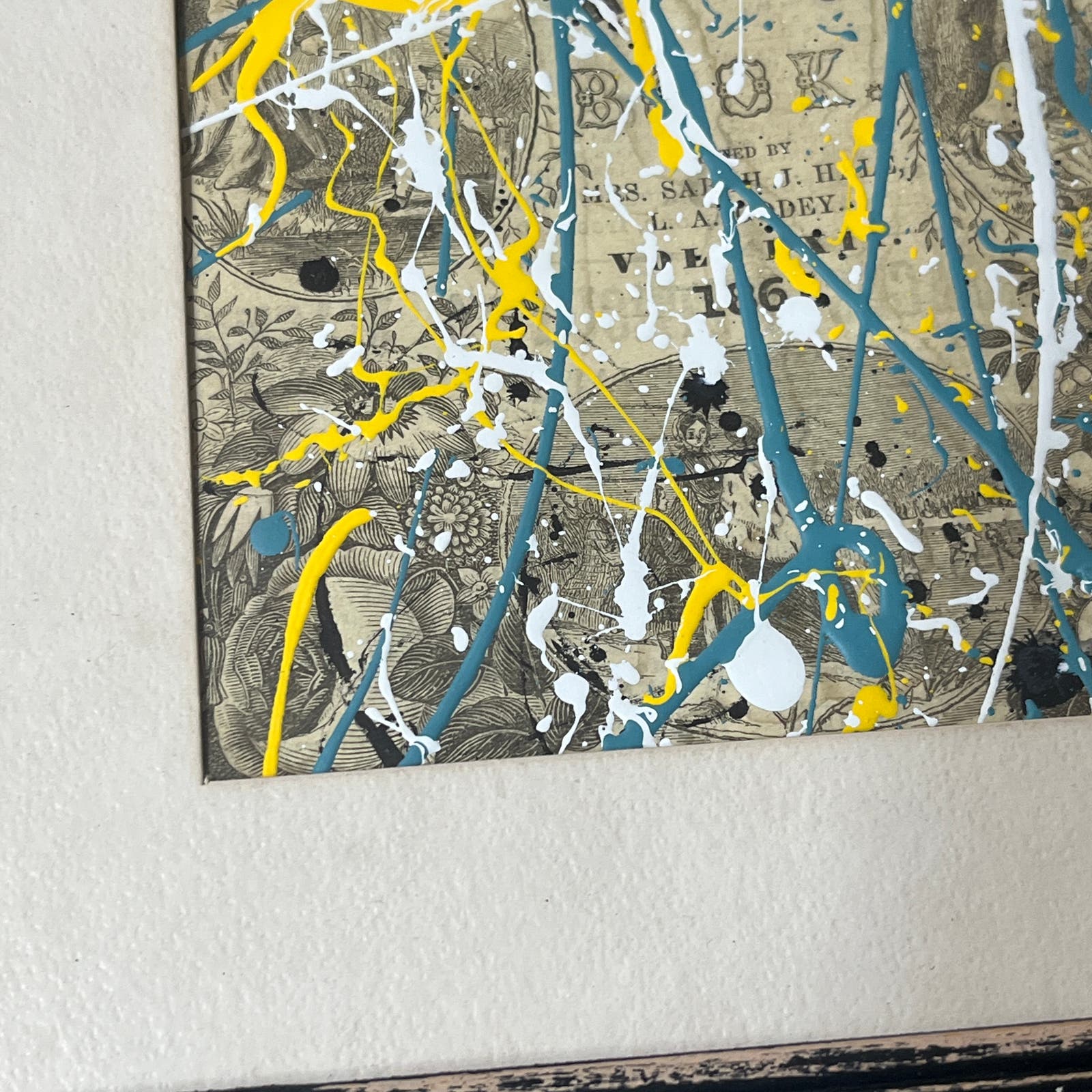 10x12" Abstract Mixed Media Art Painting. Original piece painted on the cover from an original 1861 Madam Godey's Lady's Book, in a distressed frame with matting by artist Sam Lewis. This is a great and affordable way to own a piece of original art and add a pop of color to your space. Also a great gift idea. Comes with COA.