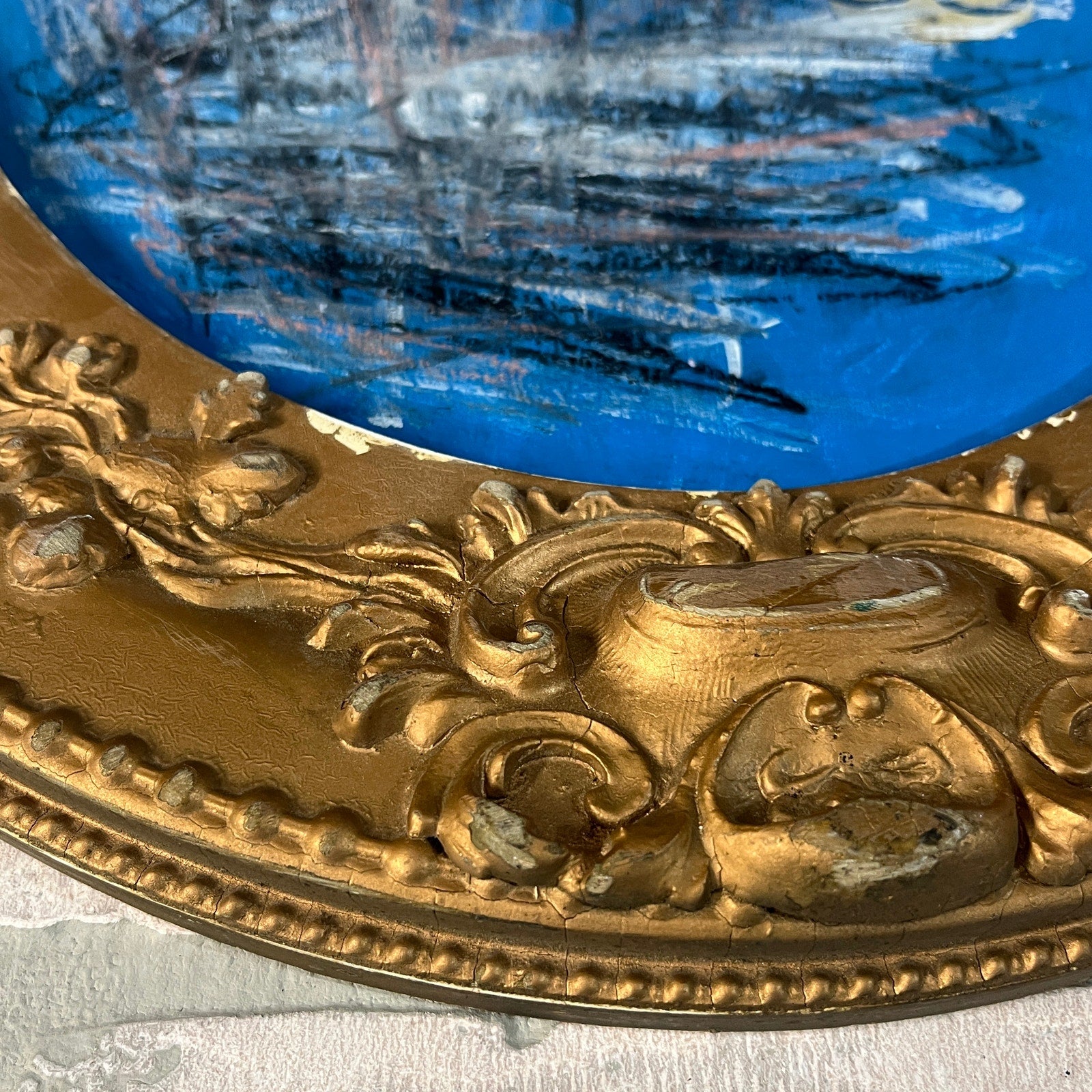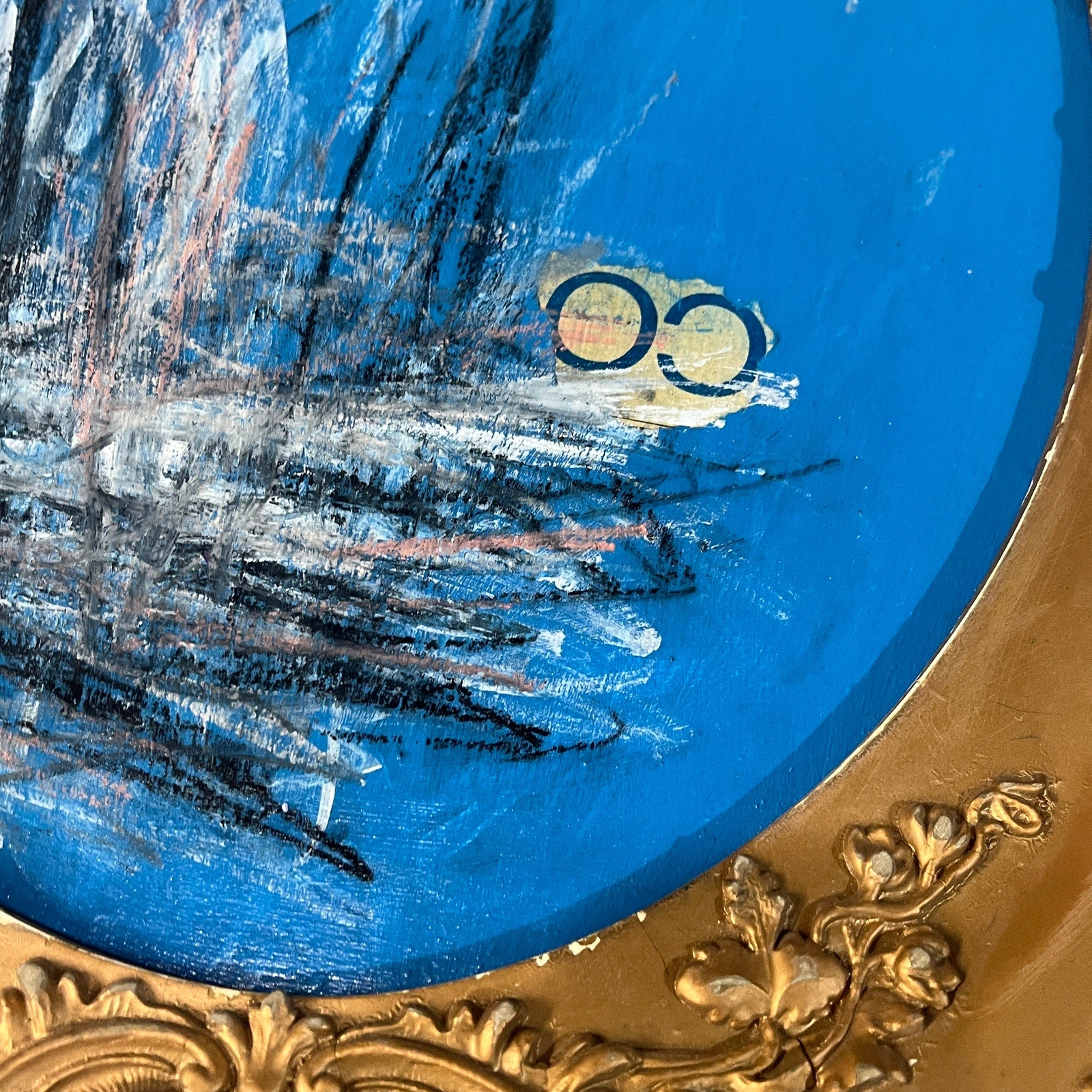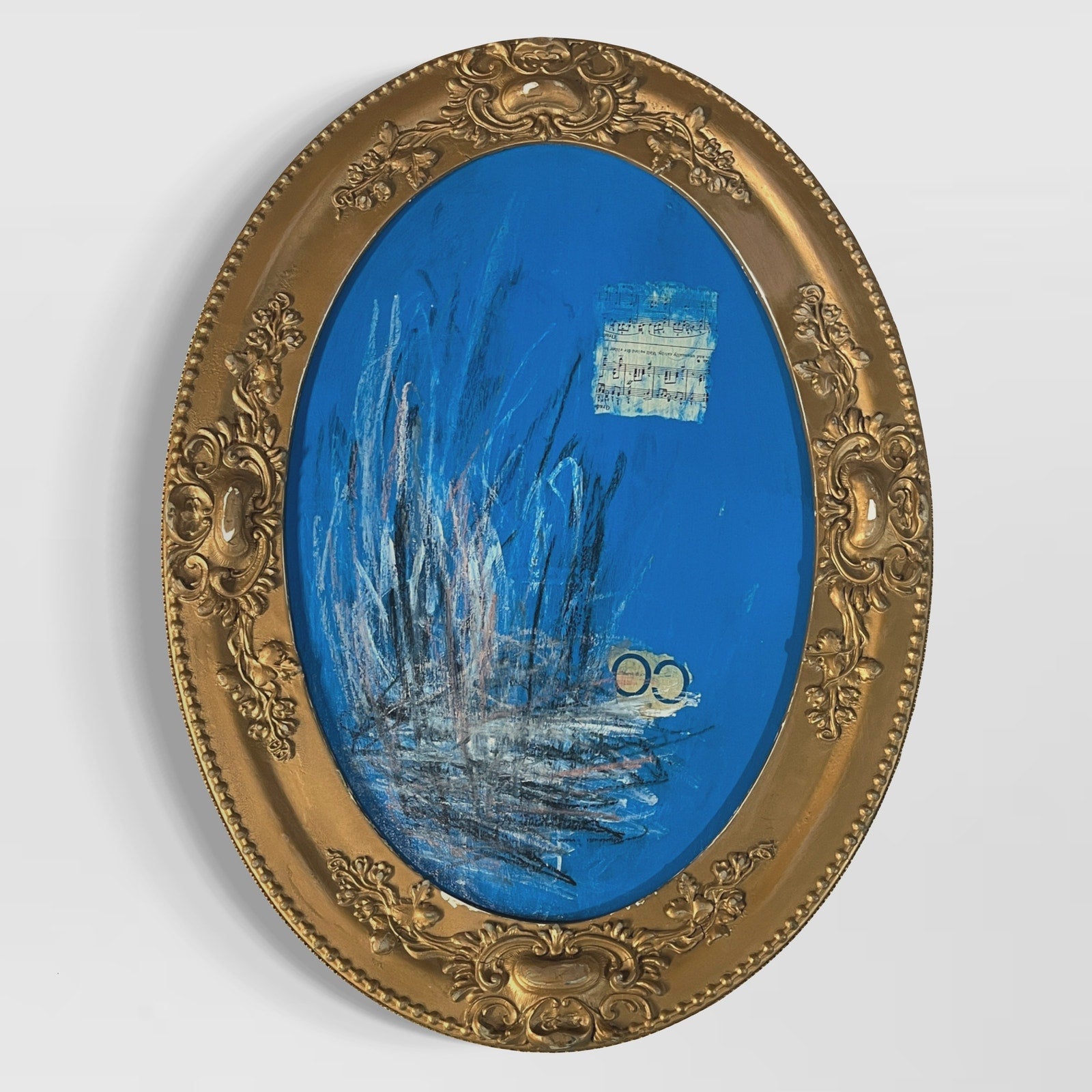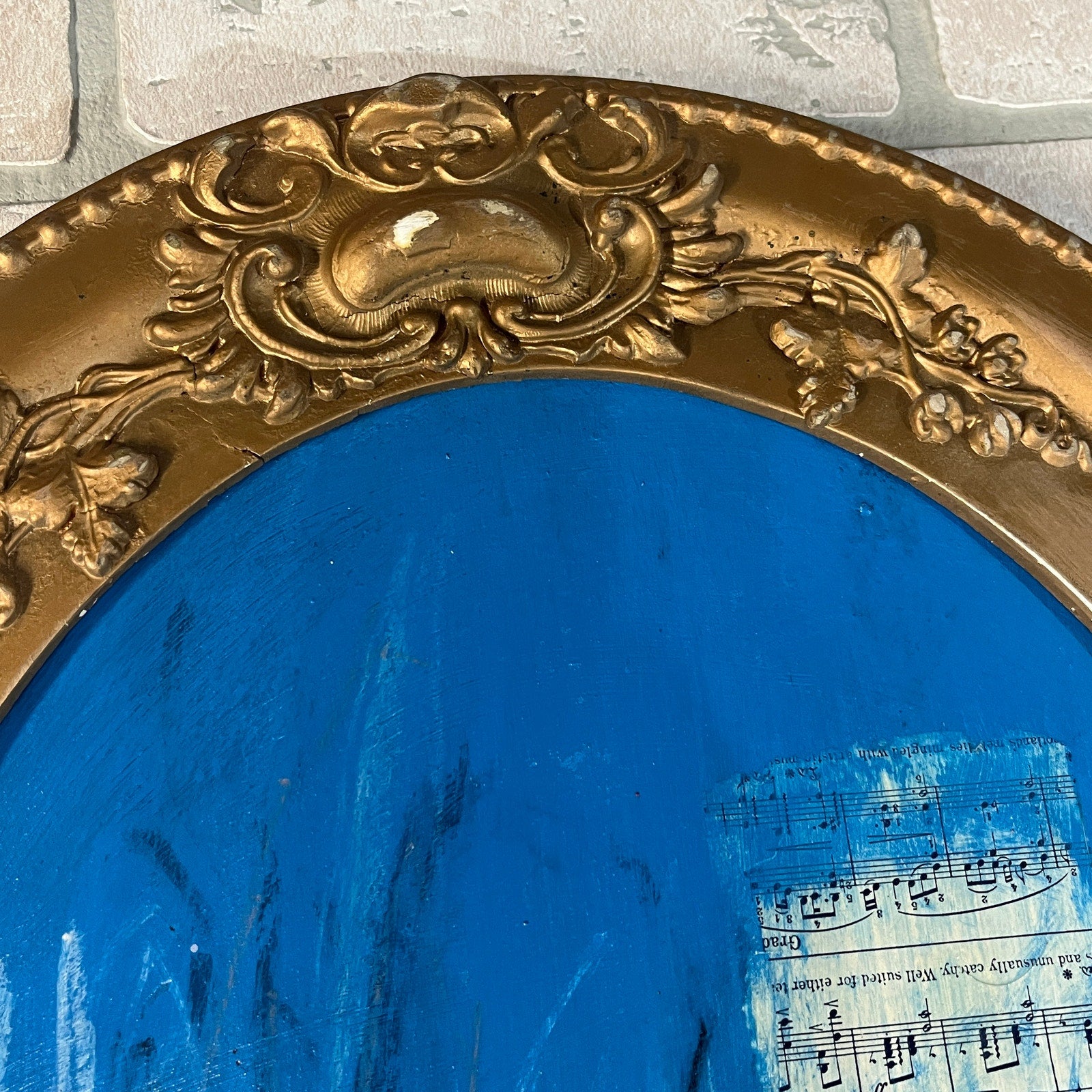 This piece is framed in antique ornate copper tone oval frame, it measures about 19x25". This is an original mixed media piece featuring vintage paper, by abstract artist Sam Lewis. This is a great and affordable way to own a piece of original art and add a pop of color to your space. Also a great gift idea. Ready to hang.