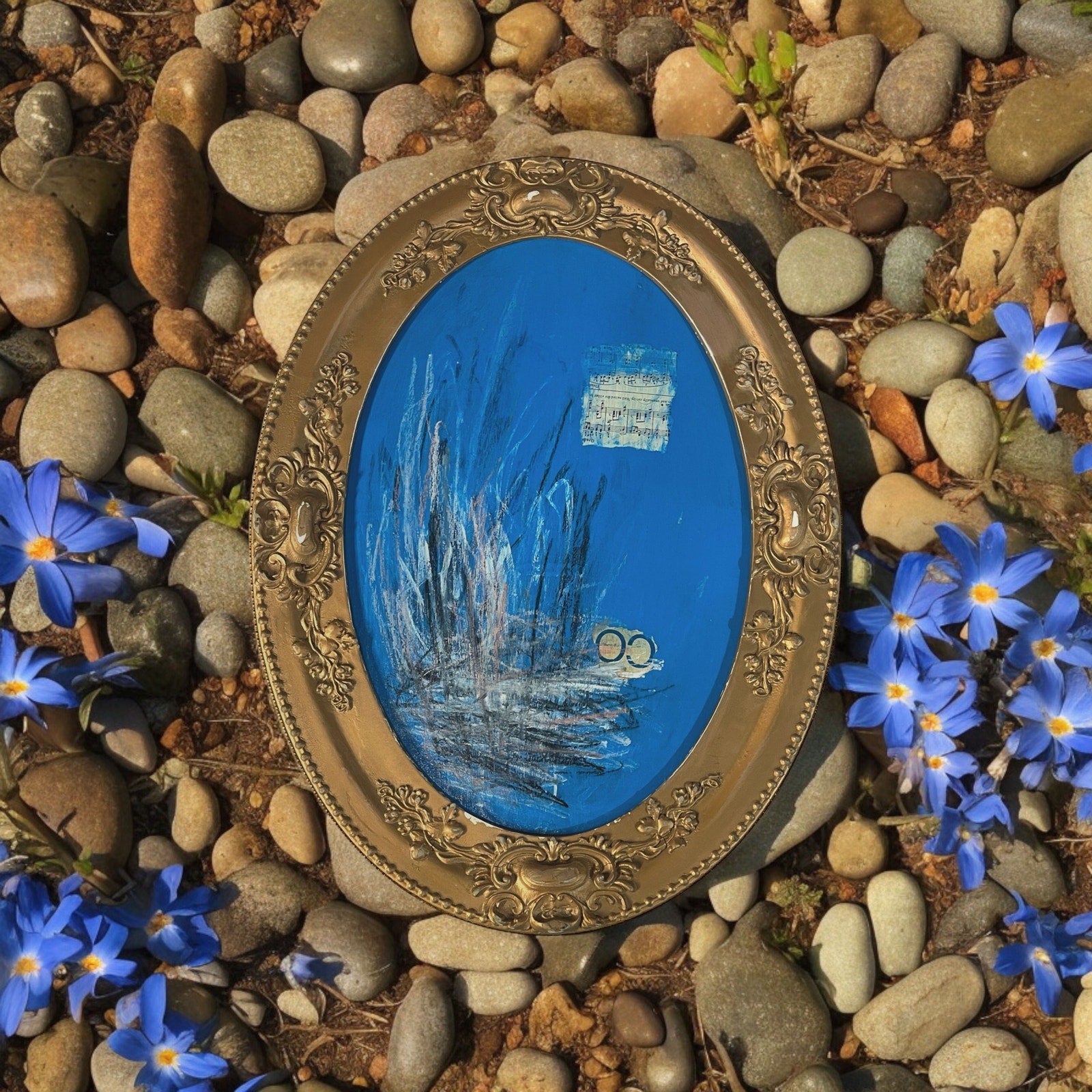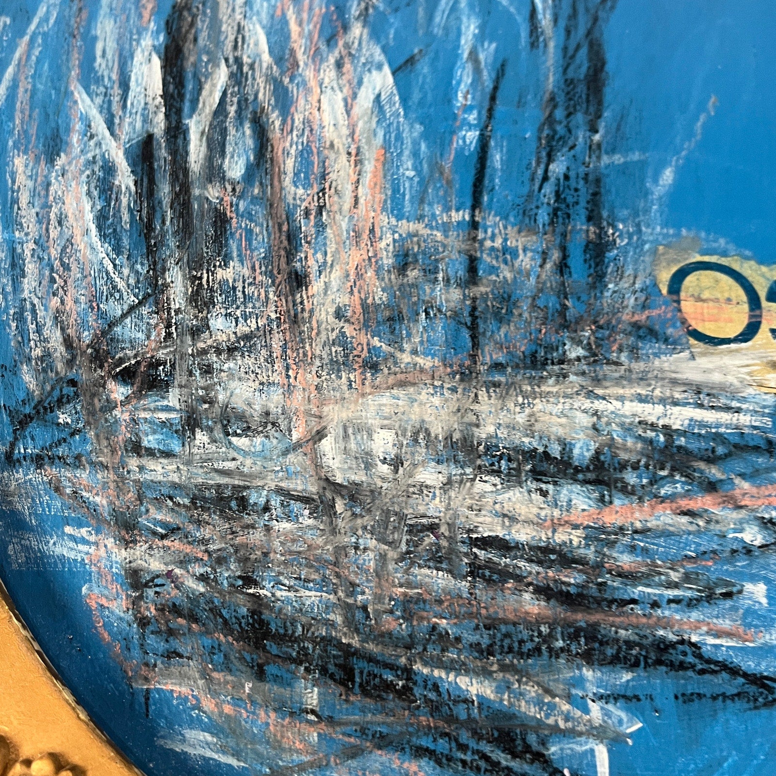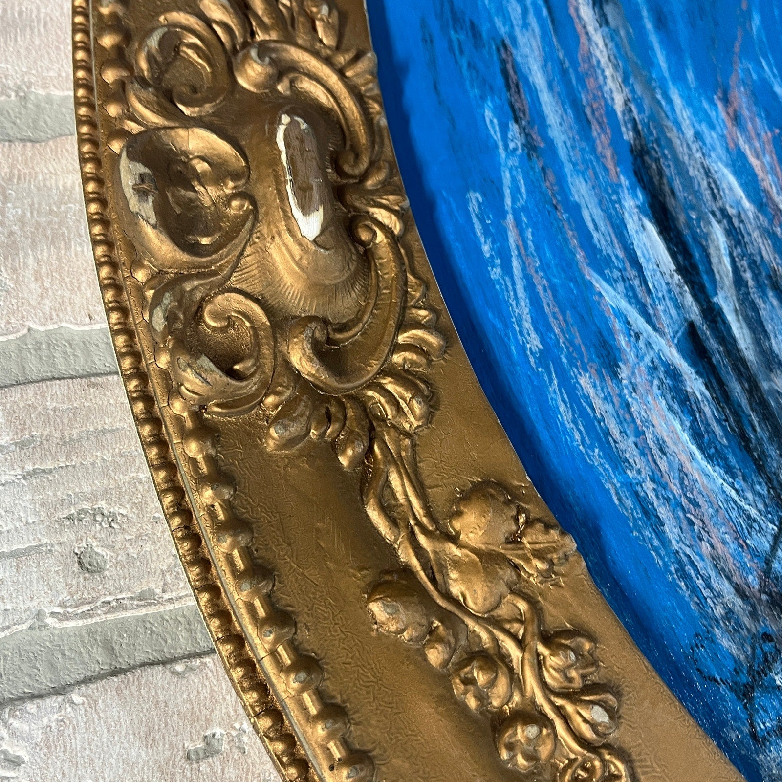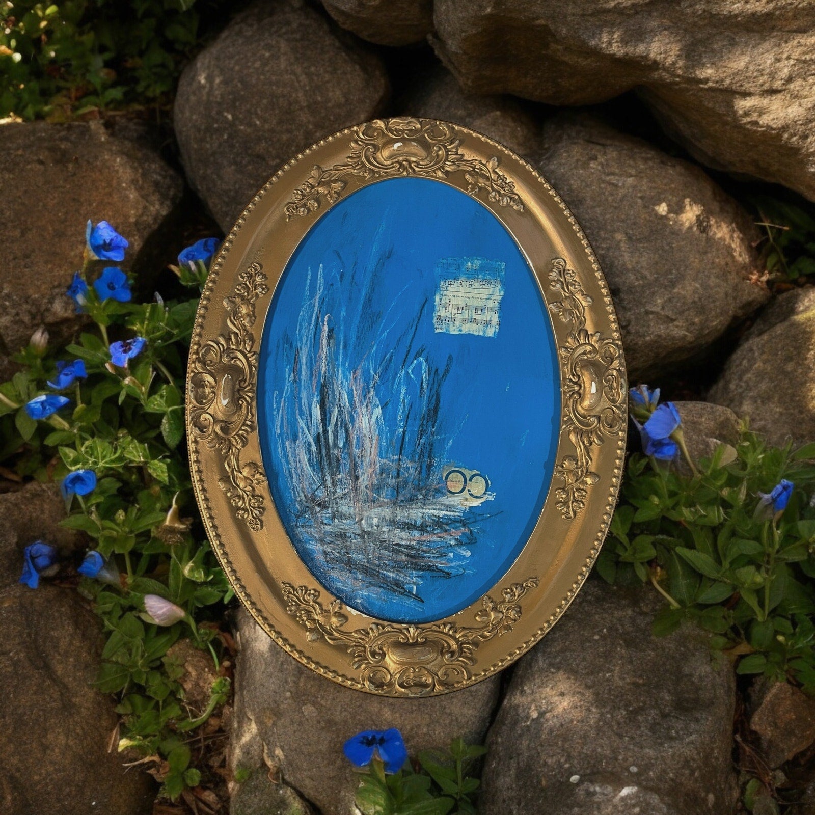 This piece is framed in antique ornate copper tone oval frame, it measures about 19x25". This is an original mixed media piece featuring vintage paper, by abstract artist Sam Lewis. This is a great and affordable way to own a piece of original art and add a pop of color to your space. Also a great gift idea. Ready to hang.