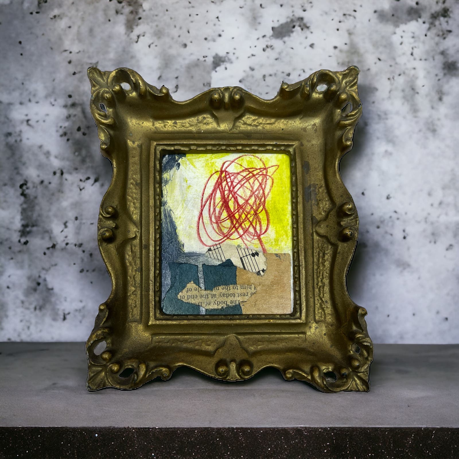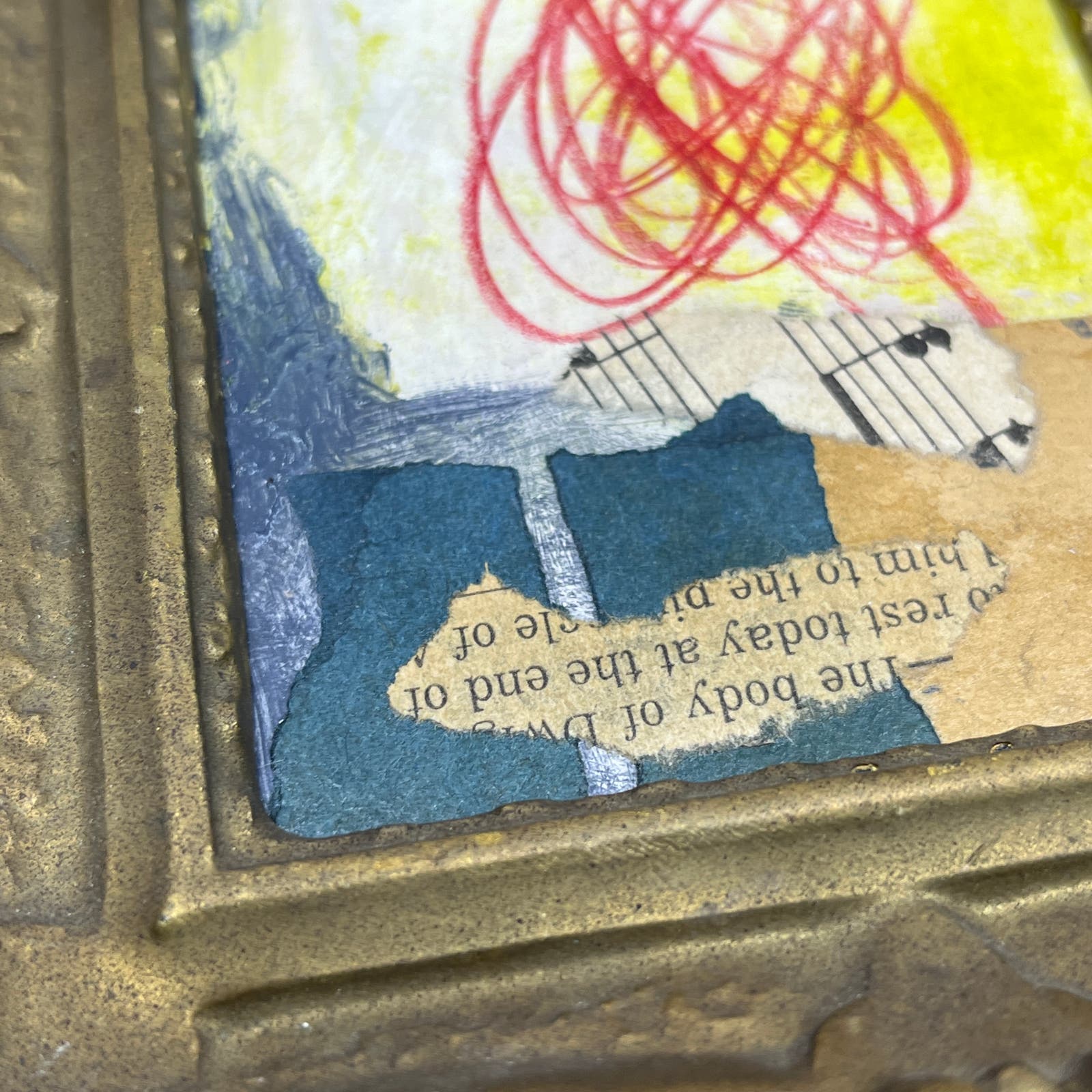 6x5" Abstract Mixed Media Art Painting. Original piece by artist Sam Lewis. Made from a reclaimed photo frame with pieces of Newspaper and Sheet Music dating to the 1905. Ready to hang. This is a great and affordable way to own a piece of original art and add a pop of color to your space. Also a great gift idea. Comes signed.