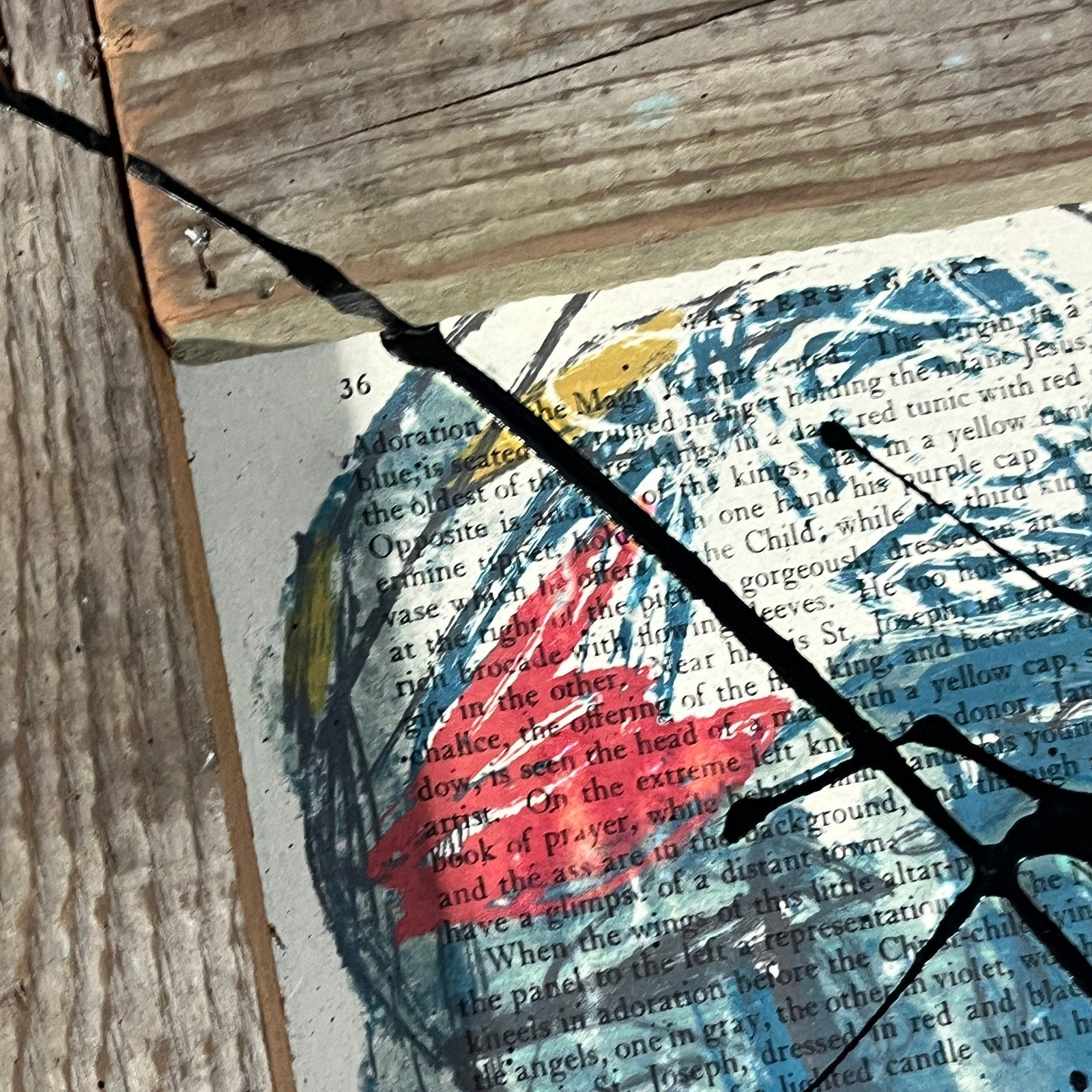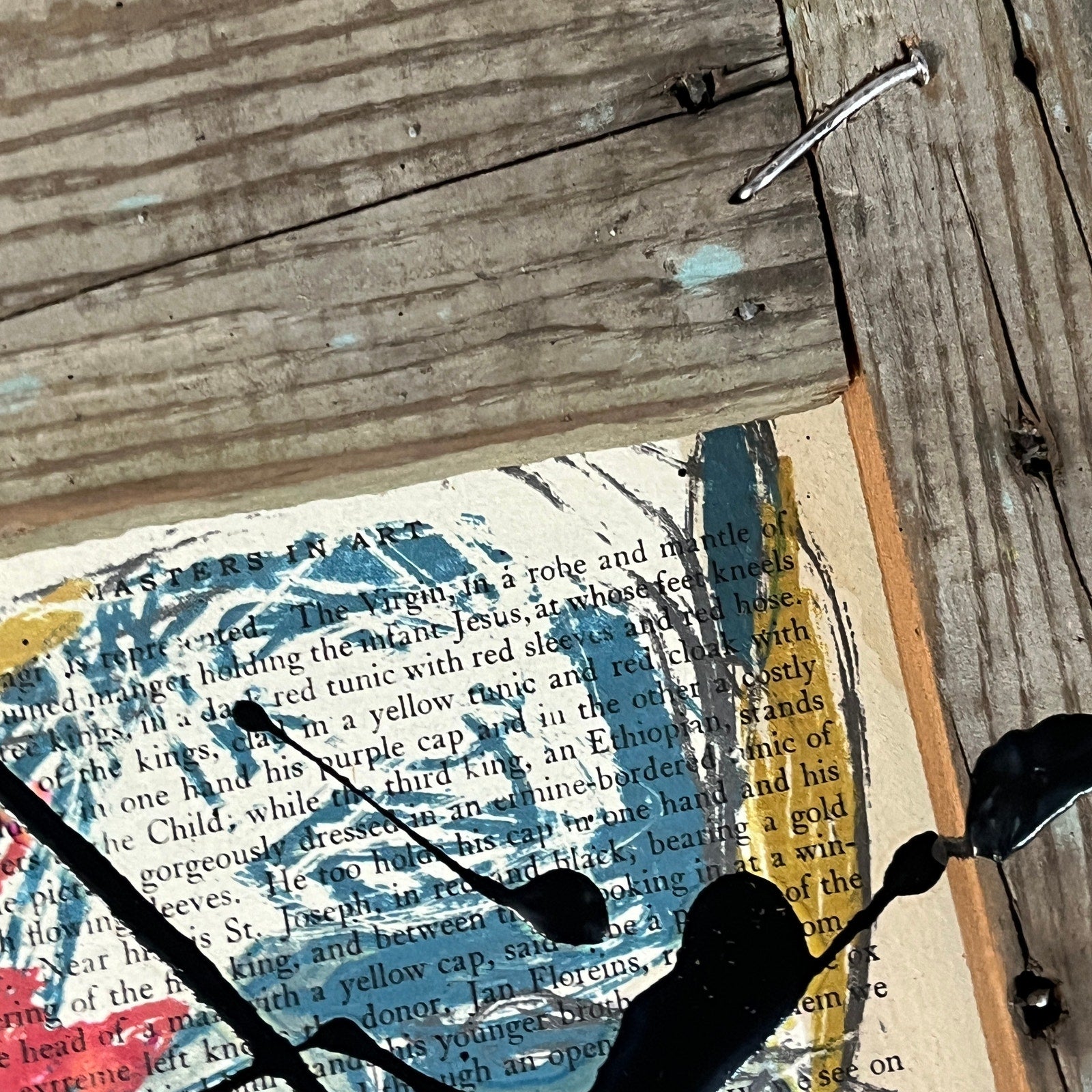 This piece is an original digital painting by abstract artist Sam Lewis. The painting has been printed on an original page from a 1905 Masters of Art magazine, then decoupaged on wood, distressed, framed with reclaimed barnwood in a rustic style, splashed with paint, and sealed with matte enamel. It measures roughly 6x9". This is a great and affordable way to own a piece of original art and add a pop of color to your space. Also a great gift idea. Ready to hang.