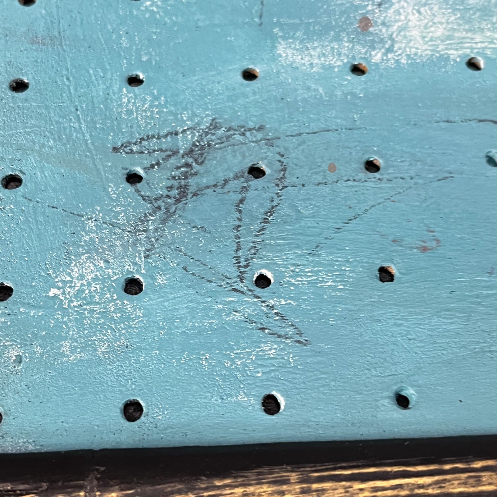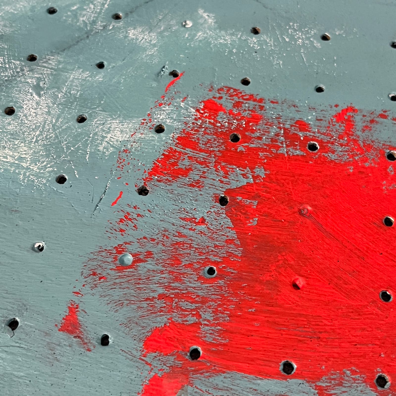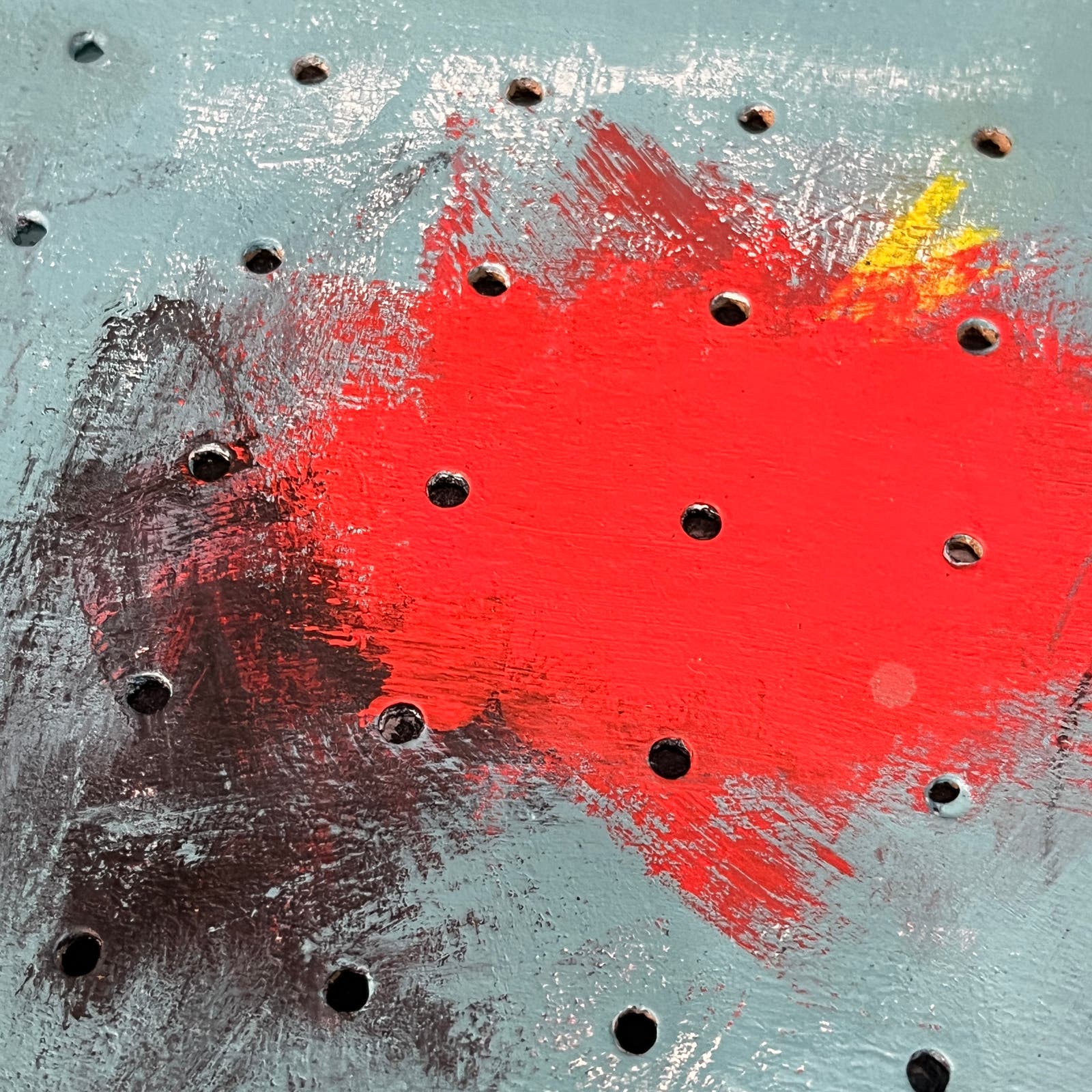 13x15" Abstract Mixed Media Art Painting. Original piece painted on reclaimed peg board in a vintage faux bamboo frame by artist Sam Lewis. This is a great and affordable way to own a piece of original art and add a pop of color to your space. Also a great gift idea. Comes with COA.
