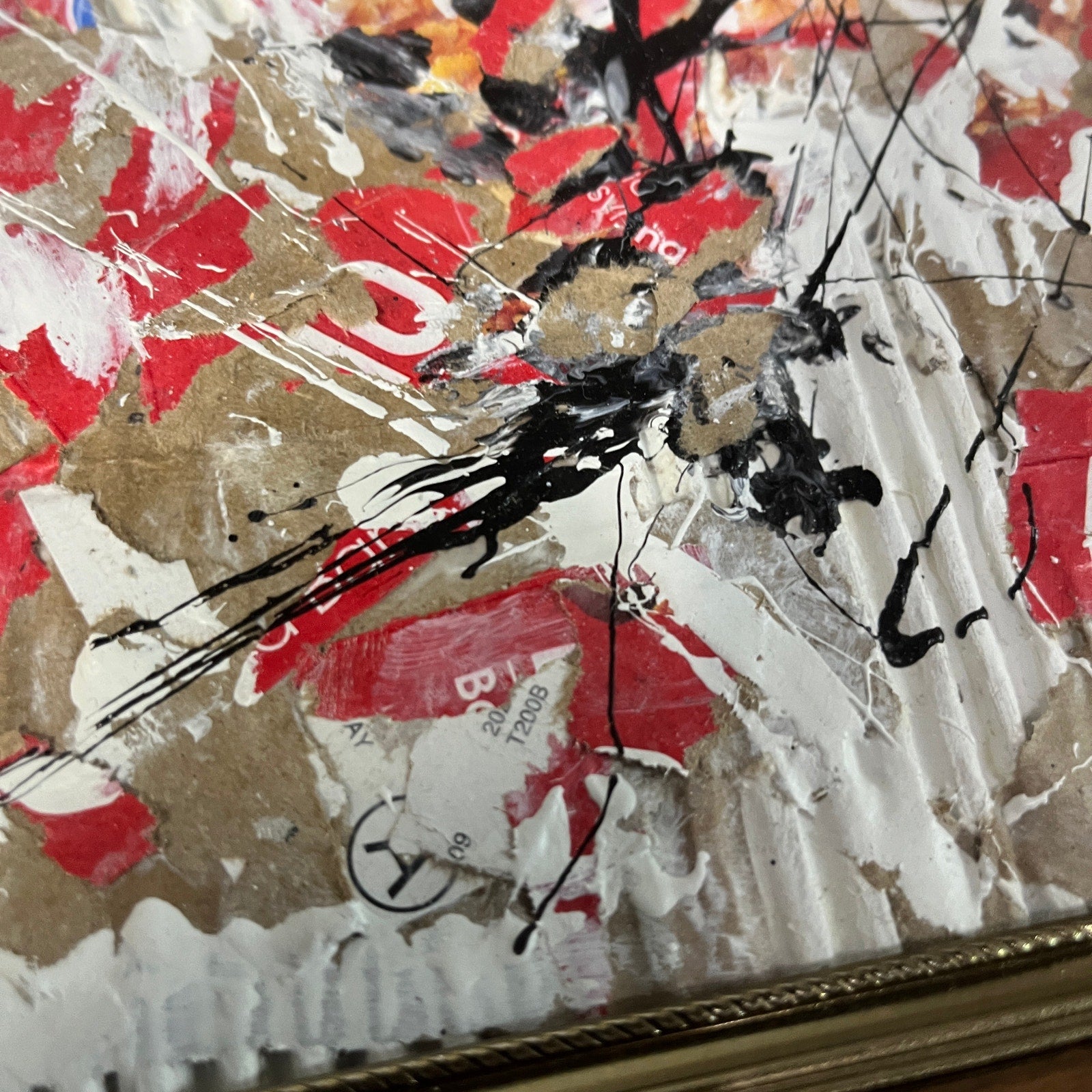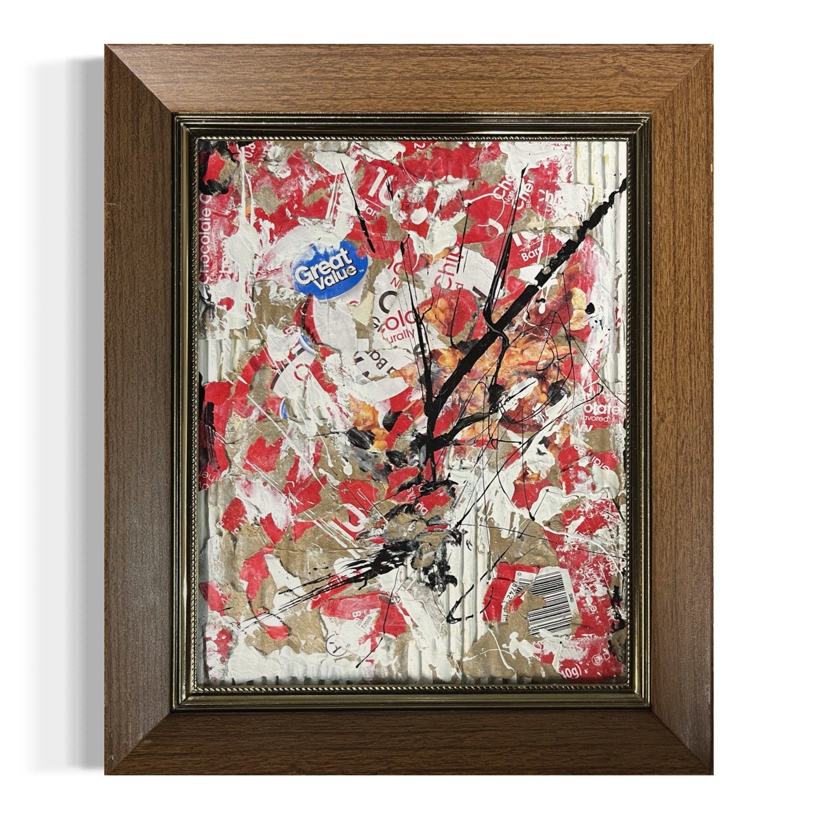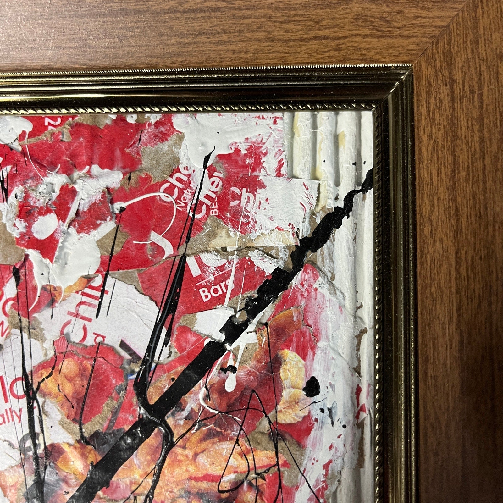 This piece is a collage made from a Great Value Chewy Granola Bar Box, and is framed in a vintage frame, it measures about 10x12". This is an original collage painting by abstract artist Sam Lewis. This is a great and affordable way to own a piece of original art and add a pop of color to your space. Also a great gift idea. Ready to hang.