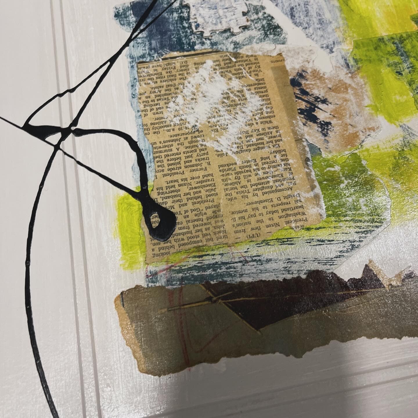 29x22 Original mixed media piece by artist Sam Lewis. This one-of-a-kind piece is made from a reclaimed painting with matting, in a rustic dark wood frame. It features a variety of original objects including sheet music and newspaper dating back to 1905. This is a great and affordable way to own a piece of original art and add a pop of color to your space. Also a great gift idea. Comes with signed COA certificate of authenticity.