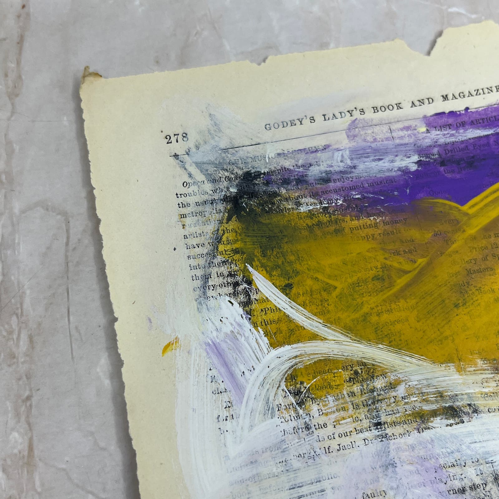 FRAME NOT INCLUDED - framed picture is intended to show how it will look matted or mounted and framed. 6x9.75”Abstract Mixed Media Art Painting on an original over 160 year old distressed antique page from a 1861 Issue of Madam Godey’s Lady’s Book. It has all the original bends, tears and blemishes that add a one-of-a-kind patina. Part of a limited collection. Original piece by artist Sam Lewis. This is a great and affordable way to own a piece of original art and add a pop of color to your space. Also a great gift idea.